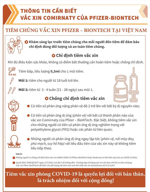 Dưới đây là các thông tin cần biết khi tiêm vaccine phòng COVID-19 Pfizer do Bộ Y tế hướng dẫn: