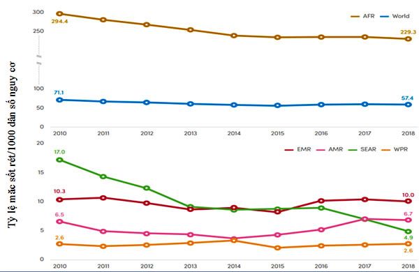 Hình 3. Tỷ lệ mắc sốt rét (ca mắc/1000 dân số nguy cơ) trên toàn cầu và theo khu vực giai đoạn 2010-2018.