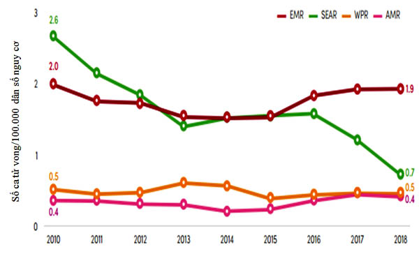 khu vực WHO Đông Nam Á; World: Thế giới; WPR: khu vực WHO Tây Thái Bình Dương, WHO: Tổ chức Y tế thế giới)