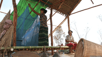Một phụ nữ Campuchia treo màn chống muỗi trong căn nhà tạm bợ ở những cánh đồng mà cô và chồng đang phát quang