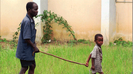 Một đứa trẻ dẫn người đàn ông bị bệnh mù đường sông ở Gbarnga, Liberia, ngày 4/9/1995