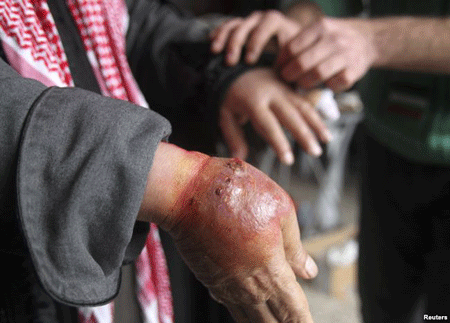 Một người đàn ông với một bàn tay có các triệu chứng của leishmaniasis chờ đợi điều trịtại một bệnh viện ở Aleppo, Syria, ngày 11/2/2013
