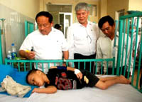 Ông Viên Quang Mai, Phó Viện trưởng Viện Pasteur Nha Trang đang thu thập thông tin của trẻ mắc bệnh tay chân miệng diễn biến nặng tại Khoa Nhi, Bệnh viện đa khoa Quảng Ngãi.Ảnh: Trí Tín |