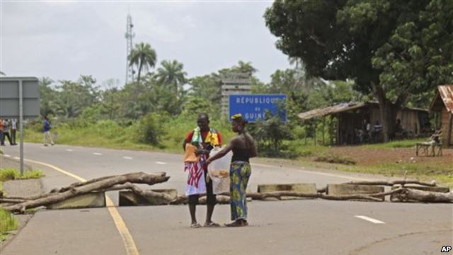 Trạm kiểm soát biên giới dịch bệnh Ebola tại một khu vực thương mại thuộc quận Kambia, Guin |
