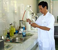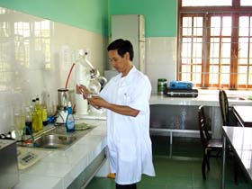 Như vậy tổng số điểm đạt trung bình là 70,6/88,1 điểmchiếm tỷ lệ 80,14%. Tuy số điểm trung bình của 10 chuẩn đạt trên 80%, nhưng theo quy định của Bộ Y tế mỗi chuẩn phải đạt trên 80% mới đạt “ Chuẩn quốc gia”. Đối với Trung tâm Y tế dự phòng tỉnh Quảng Trị vẫn còn chuẩn 2 (Cơ sở hạ tầng chỉ đạt 53,2%); chuẩn 3 ( Trang thiết bị chỉ đạt 60%). | Kiểm tra công tác xét nghiệm và la bo của Trung tâm |
