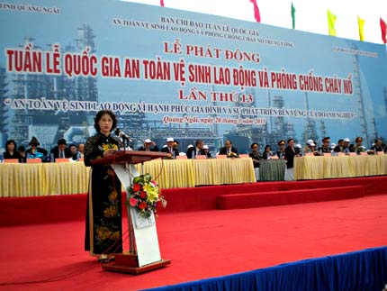 Phát biểu tại buổi lễ, bà Nguyễn Thị Kim Ngân, Bí thư Trung ương Đảng, Bộ trưởng Bộ Lao động-Thương binh và Xã hội cho biết, năm 2010 Chính phủ đã phê duyệt Chương tình Quốc gia về ATVSLĐ-PCCN giai đoạn 2011-2015. Điều này thể hiện sự quan tâm của Chính phủ tới công tác này. Chăm lo sức khỏe của người lao động, bảo đảm an toàn cho người lao động có ý nghĩa quan trọng cho sự phát triển bền vững của mỗi doanh nghiệp. Tuy nhiên, tình hình tai nạn lao động, bệnh nghề nghiệp, các sự cố cháy nổ hiện nay vẫn còn diễn biến phức tạp Vì vậy, các bộ, ngành, địa phương, doanh nghiệp trong cả nước cần tiếp tục thực hiện mạnh mẽ và quyết liệt hơn nữa việc đảm bảo ATVSLĐ và PCCN, đặc biệt là việc thực hiện hiệu quả Chương trình quốc gia về an toàn, vệ sinh lao động giai đoạn 2011-2015 mà Thủ tướng Chính phủ đã phê duyệt.