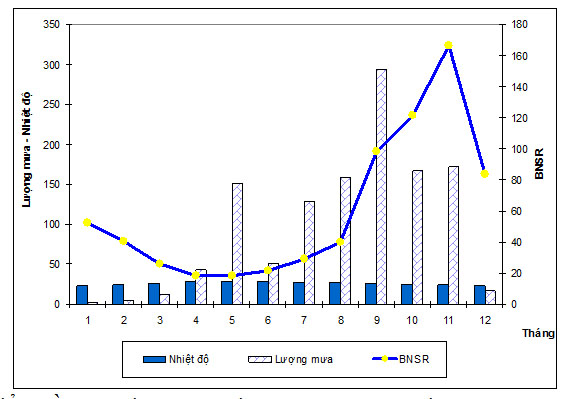 Liên quan LM, NĐ và BNSR theo tháng ở Ia Grai 2006-2010 (Biểu đồ 3.2) BNSR tăng và đạt đỉnh tháng 9-11 (giữa và cuối mùa mưa), sau đó bắt đầu giảm vào tháng 12 (mùa khô).