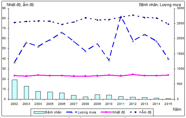 Tuy nhiên dưới tác động của biến đổi khí hậu, các yếu tố thời tiết bao gồm lượng mưa(LM), nhiệt độ (NĐ) và ẩm độ(ÂĐ) thay đổi theo từng giai đoạn 5 năm trong vòng 15 năm gần đây (2001-2015) ảnh hưởng đến trung gian truyền bệnh (muỗi sốt rét) cũng như tác nhân gây bệnh (ký sinh trùng sốt rét) và chi phối mùa truyền bệnh sốt rét trong năm.