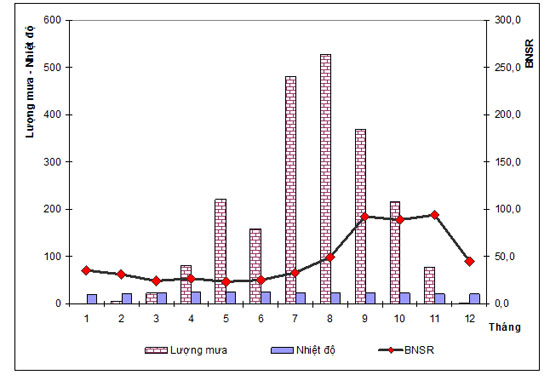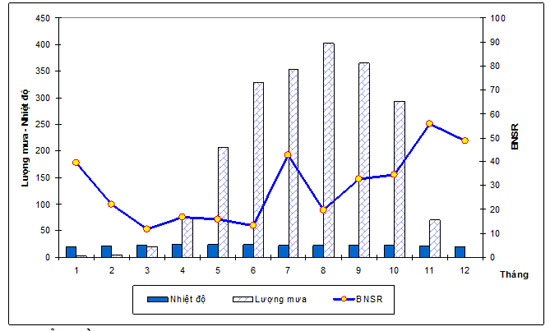 Giai đoạn 2006-2010 (Biểu đồ 3.6), BNSR giảm dần từ đầu mùa khô (tháng 12-1) đến cuối mùa khô (tháng 4), bắt đầu tăng vào đầu mùa mưa (tháng 5-6), tăng mạnh từ tháng 9 (giữa mưa) và đạt đỉnh cao nhất vào tháng 11 (cuối mưa) và bắt đầu giảm vào tháng 12 (đầu khô).
