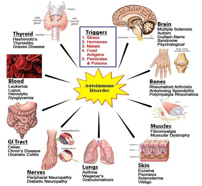 Trường hợp tự kháng thể gây hại cho cơ thể gọi là bệnh tự miễn, đặc trưng bởi cơ thể sản xuất tự kháng thể hoặc một dòng lympho T tự phản ứng để chống lại một hay nhiều tổ chức của chính cơ thể. Tế bào T, được sản xuất trong tủy xương rồi di chuyển tới tuyến ức. Tại đây, chúng được hướng dẫn để ngăn chặn việc tấn công chính các tế bào của cơ thể. Do vậy, các nhà khoa học cho rằng, nhiều bệnh tự miễn có nguyên nhân là do những trục trặc trong quá trình hướng dẫn này. Trong hình trên cho thấy bệnh tự miễn có thể ảnh hưởng và liên đới đến bất cứ cơ quan nào trong cơ thể, từ não, máu, hệ tiêu hóa, phổi, thần kinh, da, xương, cơ, tuyến giáp,…