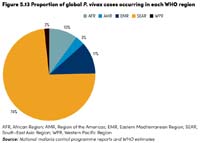 Hầu hết số ca sốt rét P. vivax xảy ra ở khu vực Đông Nam Á (theo phân vùng dịch tễ sốt rét của TCYTTG) (74%), tiếp đến là khu vực đông Địa Trung Hải (11%) và khu vực các quốc gia châu Phi (10%) (Hình 5.13). Hơn 80% ca sốt rét do P. vivax xảy ra ở 3 quốc gia gồm Ethiopia, India và Pakistan.
