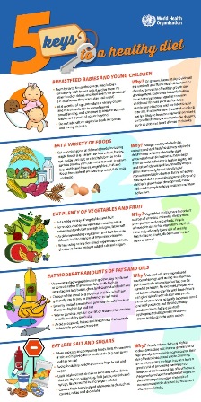 Cập nhật tháng 6/2016. Tổ chức Y tế thế giới (WHO)-5 yếu tố chìa khóa để một chế độ ăn uống lành mạnh (5 keys to a healthy diet). Theo một tài liệu hướng dẫn mới được cập nhật, WHO cung cấp 5 yếu tố chìa khóa để có một chế độ ăn uống lành mạnh ở cộng đồng.