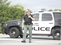 Một cảnh sát thị trấn Marietta chặn nút giao thông tại đường cao tốc 41 Hoa Kỳ trong khi một đoàn xe hộ tống đang vận chuyển một người Mỹ bị nhiễm vi-rút nguy hiểm Ebola từ Tây Phi rời khỏi căn cứ không quân trừ bị Dobbins, tại thị trấn Marietta, bang Georgia, ngày 9/9/2014 |