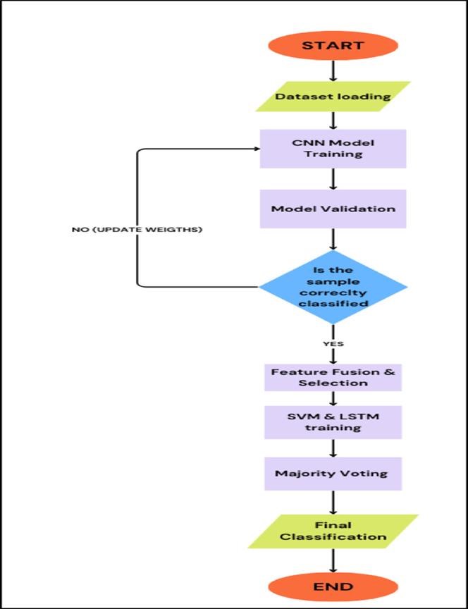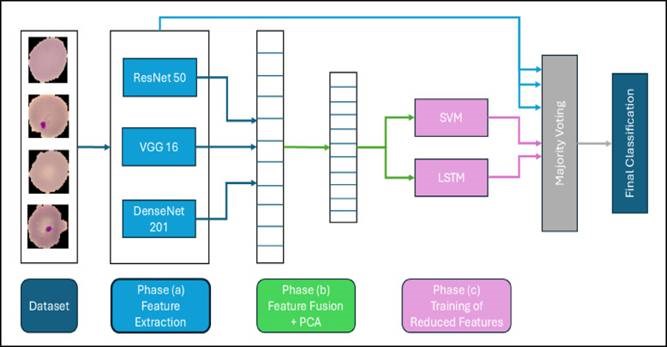 Để cải thiện hơn nữa độ tin cậy và độ chính xác của quy trình phân loại, phương pháp luận này tích hợp một cơ chế biểu quyết theo đa số. Cơ chế này được sử dụng để tổng hợp các dự đoán từ nhiều bộ phân loại, bao gồm ba mô hình học sâu từ đầu đến cuối (ResNet-50, VGG-16 và DenseNet-201), cũng như các bộ phân loại SVM và LSTM. Bằng cách kết hợp kết quả đầu ra của các mô hình đa dạng này, cơ chế biểu quyết theo đa số đảm bảo một quyết định dựa trên sự đồng thuận, làm giảm khả năng xảy ra sai sót phát sinh từ những hạn chế của bất kỳ mô hình đơn lẻ nào²⁸.Trong quy trình biểu quyết theo đa số, mỗi bộ phân loại sẽ dự đoán một cách độc lập xem hình ảnh phết máu đầu vào tương ứng với mẫu nhiễm sốt rét hay không nhiễm. Những dự đoán này được xem như các phiếu bầu, với mỗi mô hình đóng góp một phiếu cho quyết định cuối cùng. Nhãn lớp có đa số phiếu bầu sẽ được chọn làm kết quả phân loại cuối cùng. Ví dụ, nếu năm mô hình đưa ra các dự đoán như sau: