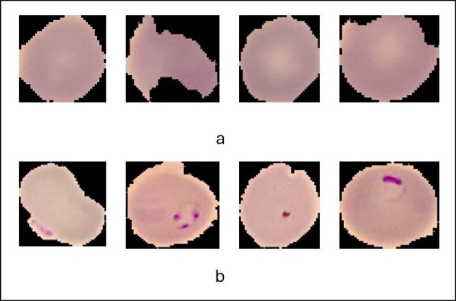 Hình. 2. Các mẫu của bộ dữ liệu được sử dụng: (a) Mẫu không nhiễm, (b) Mẫu bị nhiễm