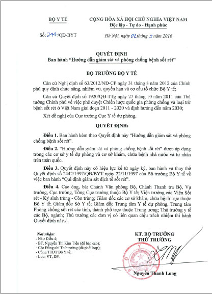 Ngày 02/3/2016, Bộ Y tế đã ban hành Quyết định số 741/QĐ-BYT về việc ban hành "Hướng dẫn giám sát và phòng chống bệnh sốt rét".