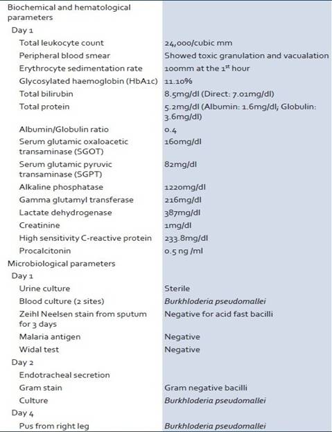 Hai tháng trước người này đã được điều trị sốt bằng Ceftriaxone vì xét nghiệm Widal trên bệnh nhân cho kết quả dương tính. Cùng lúc đó, ông tình cờ được chẩn đoán bị tiểu đường (diabetes mellitus DM). Khi được điều trị, mặc dù các triệu chứng của ông đã phần nào giảm bớt nhưng trong 7 ngày gần đây lại bị sốt cao, thở kém hơn và chán ăn. Sau đó ông đã được chuyển tới bệnh viện của chúng tôi để được chăm sóc tốt hơn.Kết quả khám cho thấy ông đã bị nhiễm độc, sốt, vàng da và mất nước. Nhiệt độ cơ thể là 38,8oC, huyết áp 90/70mm Hg, nhịp thở 50/phút, vànhịp tim 128/phút. Có nghe được âm thở phế quản bên trái và ran nổ hai bên (bilateral crackles). Lá lách phình nhẹ và không có dịch lỏng tự do trong bụng. Không phát hiện bất thường trong hệ tim mạch hoặc hệ thần kinh. Khi được kiểm tra, các mắt cá đã bị ban đỏ và phù nề. Chân phải của người này có các lớp mỡ dưới da cùng với mủ chảy ra. Mắt cá bên phải cũng bị sưng.Các xét nghiệm phòng thí nghiệm cho thấy các thông số sinh hóa và huyết học rất bất thường trong [Bảng 1] các mẫu máu và nước tiểu đã được đưa đi nuôi cấy.