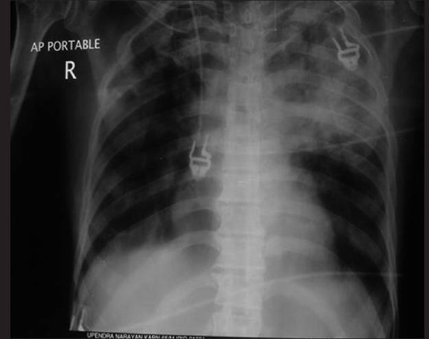 Hình ảnh X-quang ngực người này cho thấy tổn thương đông đặc đồng nhất ở thùy trái trên và lan sang các vùng mờ phế nang (alveolar opacities) trong các phần còn lại của phổi [Hình 1]. Hình ảnh siêu âm cho thấy sự tràn dịch màng phổi hai bên nhẹ và bụng ứ nước nhẹ cùng với lá lách phình.Không phát hiện thấy các tổn thương khu trú(focal lesions) và sự phình to bất thường của các cơ quan nội tạng.
