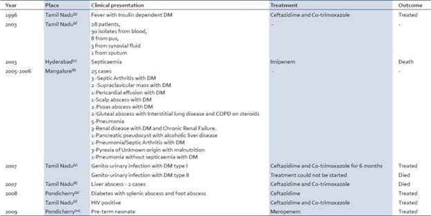 Burkhloderia pseudomallei gần đây đã thu hút sự quan tâm lớn như là một căn bệnh đang nổi tại Ấn Độ. Nó gây ra nhiều biểu hiện lâm sàng như là viêm phổi, nhiễm trùng máu, viêm khớp, áp xe, vv. Các ca bệnh đã được báo cáo từ vùngĐông Nam Á chủ yếu là Thái Lan, Malaysia, Việt Nam. Tại Ấn Độ, một vài ca bệnh đã được báo cáo chủ yếu từ vùng phía nam nước này. Ca bệnh được báo cáo này là một nam giới 65 tuổi và biểu hiện sốt 1 tháng trước, ho và khó thở cùng lúc, sưng cả hai mắt cá 7 ngày trước. B. pseudomalleiđã được phân tách từ chất tiết nội khí quản, mẫu nuôi cấy máu, vết thương ở chân. Người này đã được điều trị thành công với Imipenem và Doxycycline và hiện đang được điều trị duy trì, và đang tiến triển tốt.