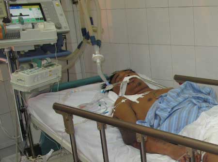Một bệnh nhân nhiễm liên cầu lợn đang hôn mê tại Bệnh viện Nhiệt đới Trung ương. Ảnh: N.P. |