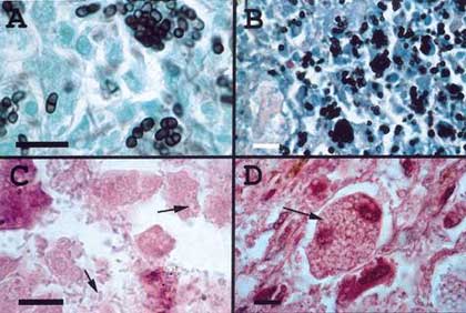 - Phương pháp giải phẩu bệnh từ bệnh phẩm nhuộm Grocott’s methenamine thấy những tế bào hình tròn hoặc hình ovale trong hoặc ngoài tế bào, đôi khi thấy những tế bào kích thước lớn, kéo dài thành hình xúc xích với kích thước tới 8 µm, có vách ngăn đặc hiệu.
