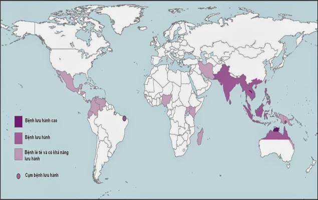 Các báo cáo đã mở rộng vùng dịch lưu hành tới các vùng của bán lục địa Ấn Độ, nam Trung Quốc, Hồng Kông, Đài Loan, các đảo khác nhau ở Thái Bình Dương và Ấn Độ Dương, những phần của châu Mỹ. Các trường hợp bệnh lẻ tẻ đã được báo cáo ở Nigeria, Gambia, Kenya, và Uganda, nhưng phạm vi bệnh ở châu Phi vẫn còn chưa được xác định chắc chắn.