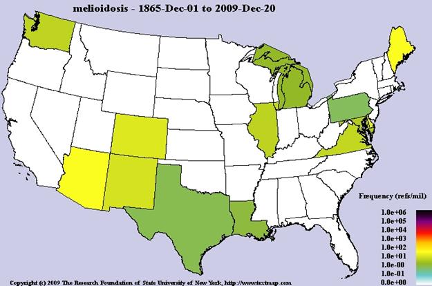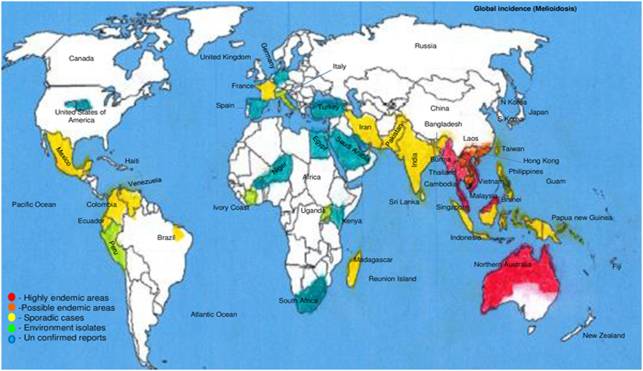 Trong số các khu vực chính ở đó Melioidosis đang lưu hành, nơi tận cùng của lãnh địa phía Bắc Úc và đông bắc Thái Lan đại diện các điểm nóng về bệnh này, với tỷ lệ mới mắc hàng năm lên tới 50/100.000 dân. Melioidosis là nguyên nhân gây tử vong hay gặp hàng thứ 3 của bệnh nhiễm trùng ở đông bắc Thái Lan, chỉ đứng sau nhiễm HIV/AIDS và Lao. Malaysia, Singapore, Việt Nam, Campuchia và Lào cũng là vùng bệnh lưu hành.