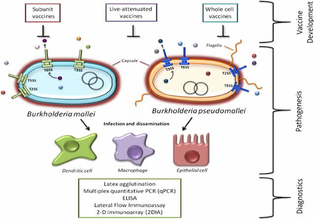 Các chủng vi khuẩn này gây bệnh ở người thì khác so với các chủng gây bệnh ở động vật nhờ vàoviệc phân tích giải mã cấu trúc gen học của vi khuẩn. B. pseudomallei có thể xâm nhập vào trong các tế bào, tổng hợp các actin và lan rộng từ tế bào này sang tế bào khác, gây nên quá trình hợp nhất các tế bào với nhau và hình thànhcác tế bào khổng lồ đa nhân (multinucleate giant cell). B. pseudomallei là một trong những “proteobacteria” đầu tiên được xác định có chứa một hệ thống bài tiết type 6.
