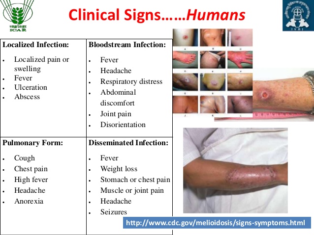 Nhiễm B. pseudomallei có những biểu hiện lâm sàng phong phú, và độ nghiêm trọng thay đổi từ một nhiễm khuẩn toàn thân bùng phát cấp tính đến một nhiễm khuẩn mãn tính (sự có mặt các triệu chứng > 2 tháng, minh chứng cho 11% tất cả trường hợp) mà có thể giống như ung thư hoặc lao. Trong một nghiên cứu mô tả 540 bệnh nhân ở vùng nhiệt đới Úc trên một thời kỳ 20 năm, có hình thái lâm sàng ban đầu là viêm phổi (51% bệnh nhân), tiếp đến là nhiễm khuẩn tiết niệu (14%), nhiễm khuẩn da (13%), nhiễm khuẩn máu không có ổ nhiễm khu trú (11%), viêm khớp nhiễm khuẩn hoặc viêm xương tủy (4%) và liên quan đến thần kinh (3%). Số còn lại 4% bệnh nhân không có bằng chứng nhiễm khuẩn khu trú.