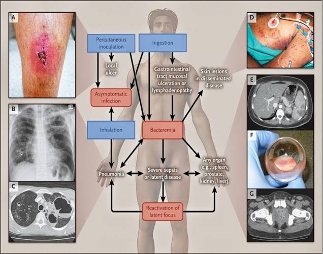 Melioidosis có thể có một loạt các biểu hiện lâm sàng đa dạng, và mức độ nặng thay đổi từ một bệnh cảnh nhiễm khuẩn toàn thân bùng phát cấp tính đến một tình trạng nhiễm khuẩn mãn tính. Biểu thị các đường nhiễm (các ô xanh: xâm nhập qua da, xâm nhập do hít vào, và nuốt phải), các dạng lâm sàng (các ô đỏ: nhiễm không triệu chứng, nhiễm khuẩn máu, hoặc tái phản ứng của ổ nhiễm khu trú), và các biểu hiện đa dạng của bệnh (phần chữ không ô).