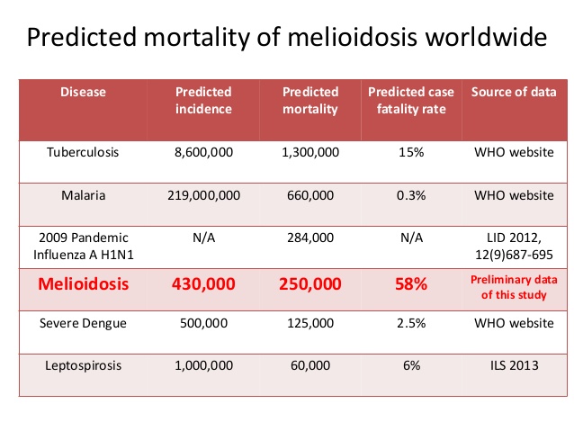 117.Suputtamongkol Y, Hall AJ, Dance DA, et al. (1994). "The epidemiology of melioidosis in Ubon Ratchatani, Northeast Thailand". International Journal of Epidemiology. 23 (5): 1082–1089. doi:10.1093/ije/23.5.1082. PMID 7860160.