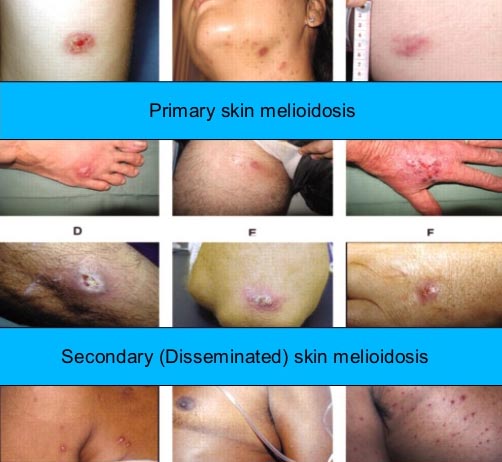 Thể bênh này nói chung là khu trú như một vết loét, nốt hoặc abces da niêm do quá trình mầm bệnh xuyên qua da vào các vết thương sẵn có. Thể cấp tính của bệnh Melioidosis có thể biểu hiện sốt và đau cơ toàn thân. Bệnh có thể biểu hiện khu trú hoặc có thể diễn tiến nhanh chóng gây nhiễm trùng huyết.