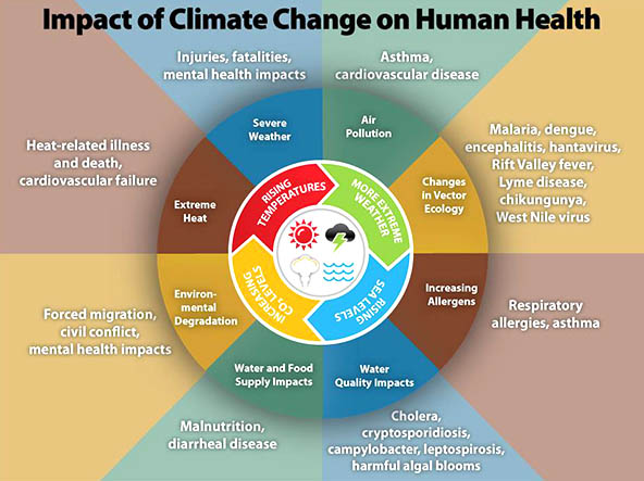 Theo một nghiên cứu mới do các nhà nghiên cứu tại Đại học Y khoa Anschutz: Ngoài việc gây thiên tai tàn phá đối với các cộng đồng dễ bị tổn thương thường thì biến đổi khí hậu cũng có thể thúc đẩy sự bùng phát của các bệnh truyền nhiễm như Zika, sốt rét và sốt xuất huyết. "Biến đổi khí hậu tạo ra các mối đe dọa phức tạp và rất rộng lớn đối với sức khỏe con người," Cecilia Sorensen, MD, tác giả chính và nghiên cứu sinh của Quỹ Living Closer về khí hậu và chính sách y tế tại CU Anschutz nói. Nó có thể khuyếch đại và phơi bày các điểm yếu về mặt sinh thái và chính trị xã hội và tăng nguy cơ các kết cục sức khoẻ bất lợi ở các vùng dễ bị tổn thương về xã hội.