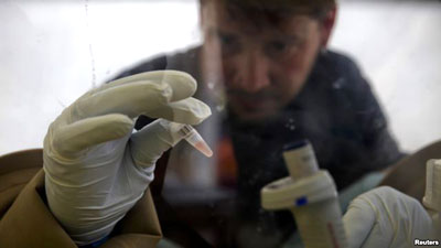 | Một nhà khoa học đang tách tế bào máu khỏi các tương bào để cô lập bất cứ RNA Ebola nhằm xét nghiệm virus tại Phòng thí nghiệm di động châu Âu ở Gueckedou, Guinea, Tháng 4/2014 |