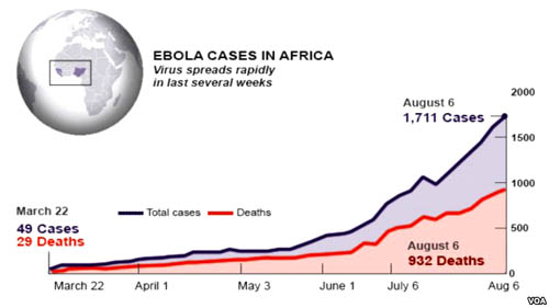 Theo thông tin cập nhật đến 6/8/2014, Tổ chức Y tế thế giới (WHO) đã ghi nhận 1.779 trường hợp nhiễm vi rút Ebola tại 4 nước khu vực Tây Phi: Guinea (495 ca), Liberia (554 ca), Sierra Leone (717 ca), Nigeria (13 ca); trong đó có 961 trường hợp tử vong: Guinea (367 tử vong), Liberia (294 tử vong), Sierra Leone (298 tử vong) và Nigeria (2 tử vong).