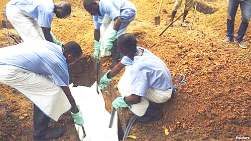 Các tình nguyện viên đang chôn cất một tử thi đã được xử lý an toàn để đảm bảo không lây lan sang cho những người khác của dịch bệnh Ebola, khu vực Kailahun, Sierra Leone, 18-07-2014 |