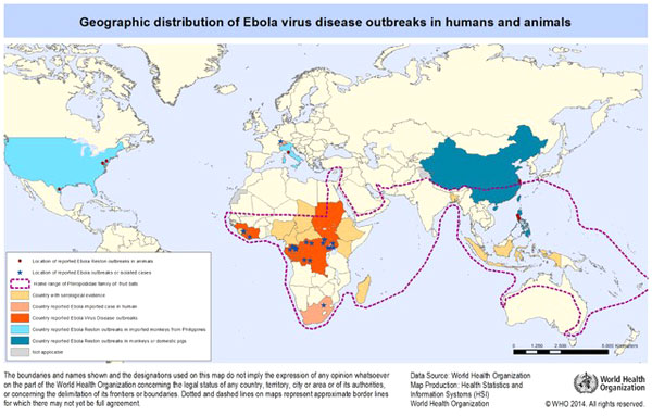Theo Tổ chức Y tế thế giới (WHO) đến ngày 21/11/2014 đã ghi nhận 15.417 ca mắc, trong đó 5.508 tử vong ở 7 quốc gia châu Phi: Liberia (7.082 ca mắc, 2.963 tử vong); Sierra Leone (6.190 ca mắc, 1.267 tử vong); Guinea (2.047 ca mắc, 1.214 tử vong); Mali (6 ca mắc, 6 tử vong); Nigeria (20 ca mắc, 8 tử vong); Senegal (1 ca mắc, 0 tử vong); DRC (66 ca mắc, 49 tử vong) và 2 quốc gia ngoài châu Phi: Tây Ban Nha (1 ca mắc, 2 tử vong); Hoa Kỳ (4 ca mắc, 1 tử vong). Trong số 596 nhân viên y tế mắc Ebola có 345 tử vong. WHO cho biết sự bùng phát dịch Ebola tại DRC là riêng biệt với khu vực Tây Phi và đã qua 42 ngày không ghi nhận ca mắc mới, việc tăng cường giám sát, hỗ trợ tại 3 quốc gia Tây Phi (Guinea, Liberia, Sierra Leone) đã tốt hơn nhưng cần mở rộng giám sát tại Mali.