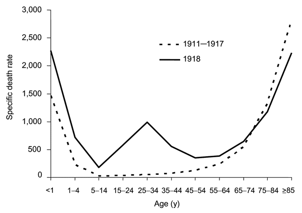 Tỷ lệ tử vong do các chủng virus cúm các năm 1911, 1917 và 1918. |