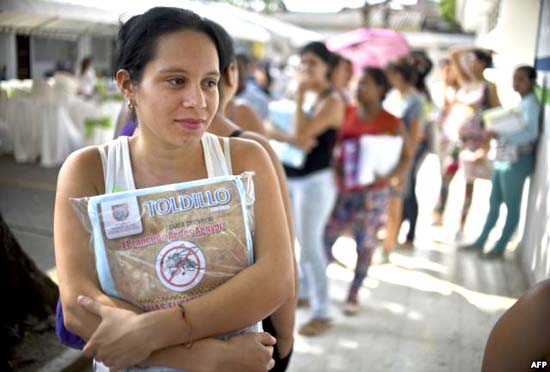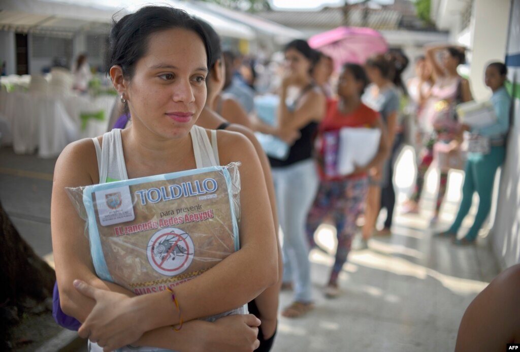 Một phụ nữ mang thai ôm màn chống muỗi ở Cali, Colombia, ngày 10/2/2016. Bộ Y tế Colombia đã bắt đầu cung cấp màn chống muỗi