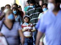 Người dân mang mặt nạ phòng cúm tập trung bên ngoài tòa nhà sau một trận động đất ở Mexico City ngày 27/4. (Ảnh: THX). | Người dân Mexico đeo khẩu trang đi lại trên những tuyến đường trong thành phố. Ảnh: Reuters |