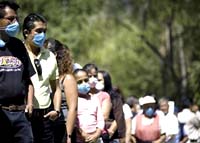 Một nhân viên y tế Thái Lan đeo khẩu trang trong suốt buổi họp báo công bố 2 trường hợp nhiễm bệnh tại Bangkok - Ảnh: AFP | Người dân Mexico đứng chờ xét nghiệm Ảnh: AFP |