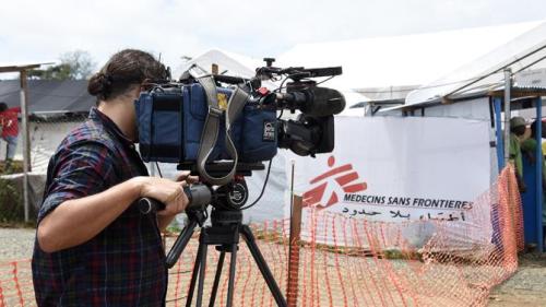 Một quay phim tác nghiệp bên ngoài trung tâm điều trị Ebola tại Liberia