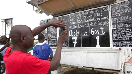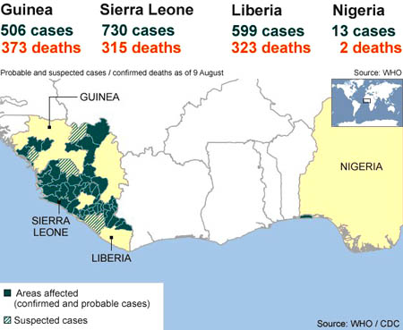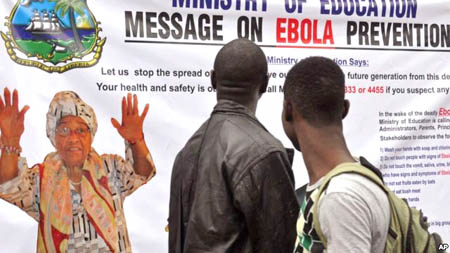 Ngày 10/08/2014. VOA News - Virus Ebola hoành hành các nước Tây Phi (Ebola Grips West Africa). Tổng thống Liberia, bà Ellen Johnson Sirleaf đang trấn an các nhân viên y tế rằng nhiều nguồn lực hỗ trợ để đối phó virus Ebola đang trên đường đến. Bà đã gặp gỡ các nhân viên y tế vào ngày thứ bảy tại thủ đô Monrovia và họ đã yêu cầu được trả lương cao hơn cùng với điều kiện làm việc tốt hơn, Tổng thống hứa hẹn sẽ có phản ứng nhanh về những khiếu nại về tiền lương nhưng yêu cầu sự kiên nhẫn đối với các nhu cầu khác bao gồm vấn đề cần nhiều xe cứu thương hơn. Liberia, Guinea và Sierra Leone đã có gần 1.000 ca tử vong do virus Ebola. Guinea thông báo rằng họ đã đóng cử biên giới với Liberia và Sierra Leone.