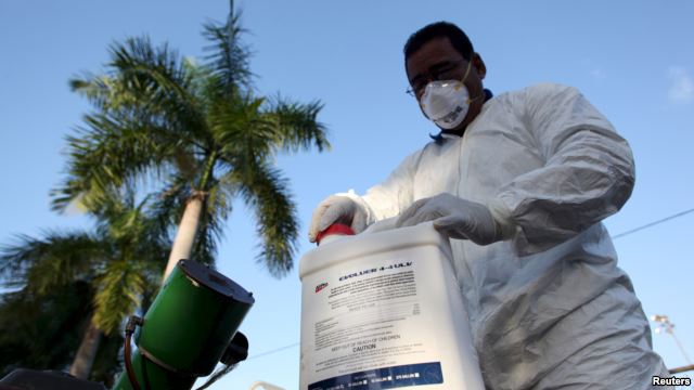Nhân viên y tế chuẩn bị thuốc diệt côn trùng trước khi phun ở San Juan, Puerto Rico, ngày 27/1/2016