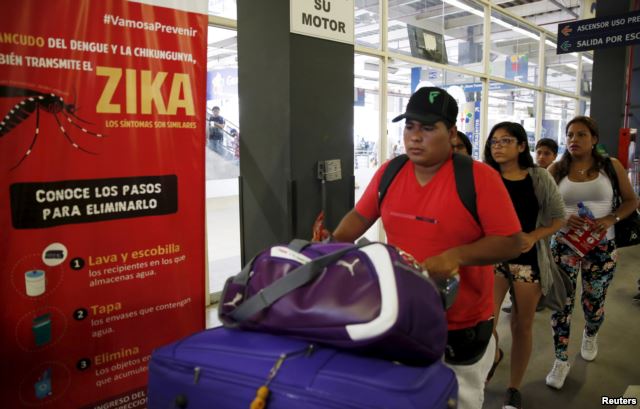 Khách du lịch đi ngang qua một áp phích quảng cáo thông tin về virus Zika trong chiến dịch của Bộ Y tế Peru tại trạm xe buýt Plaza Norte ở Lima, Peru, ngày 4/2/2016