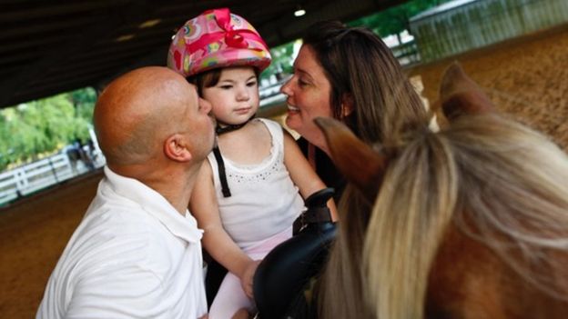 Con bé được điều trị hippotherapy, cưỡi ngựa để xây dựng sức bền bên trong và con bé yêu thích điều này. Con bé không thể tự cầm cương nhưng chuyển động của loài ngựa tương tự với khi con người đi bộ, con bé giờ đã có thể tự ngồi lên lưng ngựa và biết rằng nó được yêu thương, chăm sóc và tôi tin rằng nó rất hạnh phúc.
