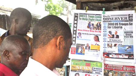 | Người dân đọc các bài báo về tuyên bố của Tổng thống Mỹ, Barack Obama về việc đưa quân lính đến chiến đấu với dịch bệnh Ebola tại Monrovia, Liberia, ngày 19/09/2014 |