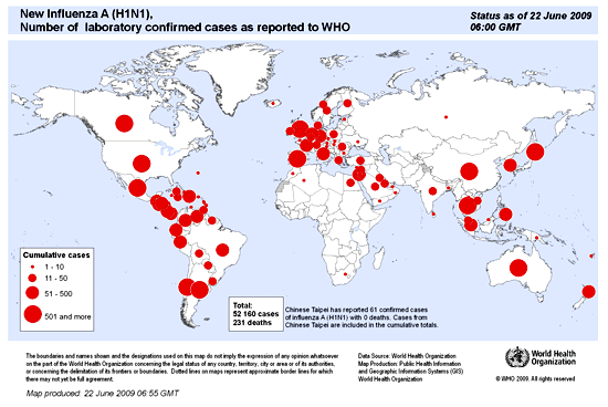 Theo bảng tin cập nhật mới nhất về đại dịch cúm A(H1N1) số 52 của Tổ chức y tế thế giới (Influenza A (H1N1)- update 52) ra lúc 07 giờ (GMT), ngày 22/06/2009 cho biết đến dựa trên các kết quả các ca bệnh được xác định mới một cách chính thức do WHO thì có đến 99 quốc gia và vùng lãnh thổ có ca bệnh nhiễm cúm A (H1N1), trong đó tổng số ca mắc lên đến 52.160 ca, với 231 ca tử vong (xem tham khảo thêm phần bản đồ phân bố các ca bệnh đến này 22/06/2009 theo WHO).