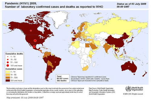 Theo thông báo từ Tổ chức Y tế thế giới (WHO) về đại dịch cúm A (H1N1) 2009 bản tin cập nhật update 57 đã xác định các ca bệnh đến thời điểm cuối ngày 3 tháng 7 năm 2009 (lúc 9 giờ theo giờ GMT) là 89.921 ca với 382 trường hơp tử vong, trong đó số ca nhiễm mới và tử vong mới kể từ báo cáo trước (báo cáo ngày 1 tháng 7) là 12.720 ca và 50 trường hợp tử vongtrên phạm vi 125 quốc gia và vùng lãnh thổ.