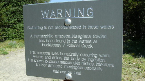 Bảng cảnh báo bơi lặn ở hồ Huckleberry, California, USA có thể nhiễm amip Naegleria fowleri (ảnh: soakersforum.com) |